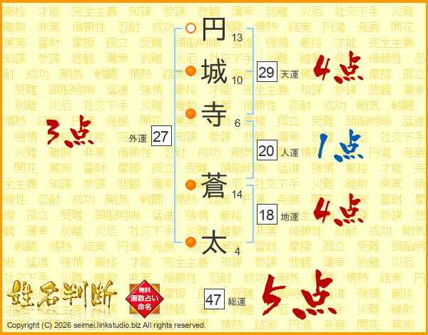 円(13画)城(10画)寺(6画) 蒼(14画)太(4画)