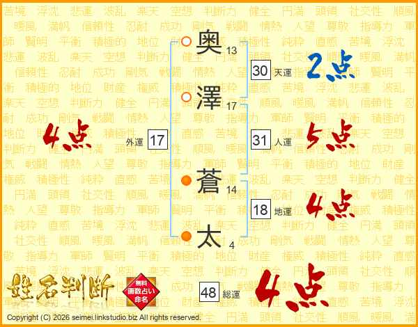 奥(13画)澤(17画) 蒼(14画)太(4画)