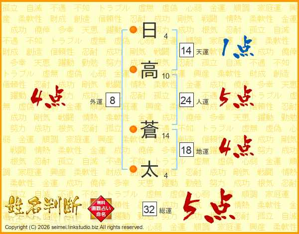 生活面を象徴する運勢です。外部から受ける影響力を表し、結婚運、家庭運や職場、環境への順応性を表します。総運から人運を引いた画数。姓や名が1文字の場合を除く。