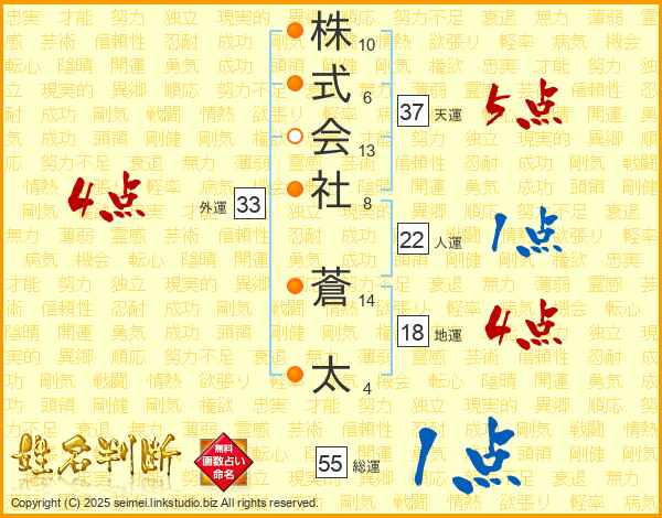 株(10画)式(6画)会(13画)社(8画) 蒼(14画)太(4画)