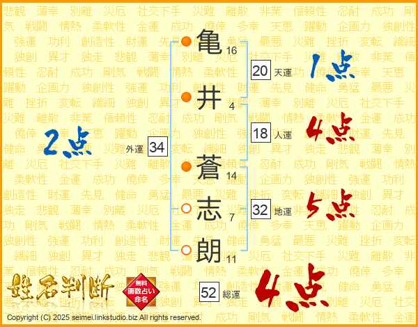 亀(16画)井(4画) 蒼(14画)志(7画)朗(11画)