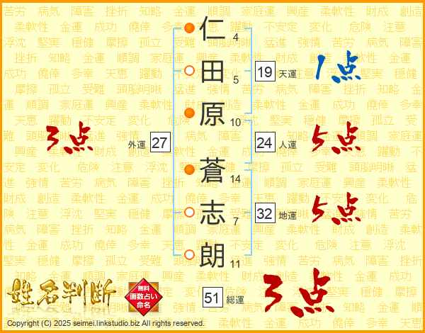 仁(4画)田(5画)原(10画) 蒼(14画)志(7画)朗(11画)
