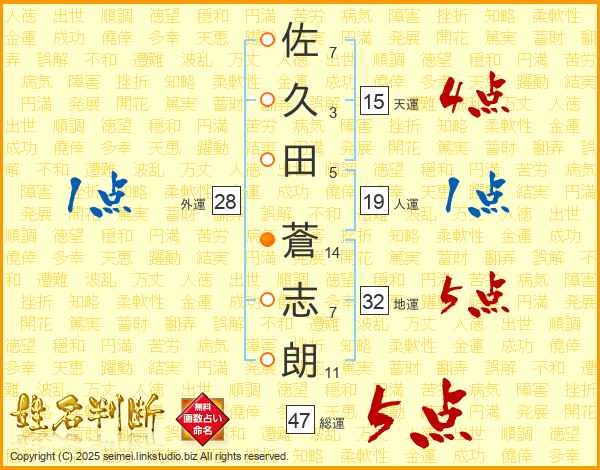 佐(7画)久(3画)田(5画) 蒼(14画)志(7画)朗(11画)