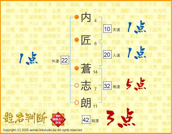 内(4画)匠(6画) 蒼(14画)志(7画)朗(11画)