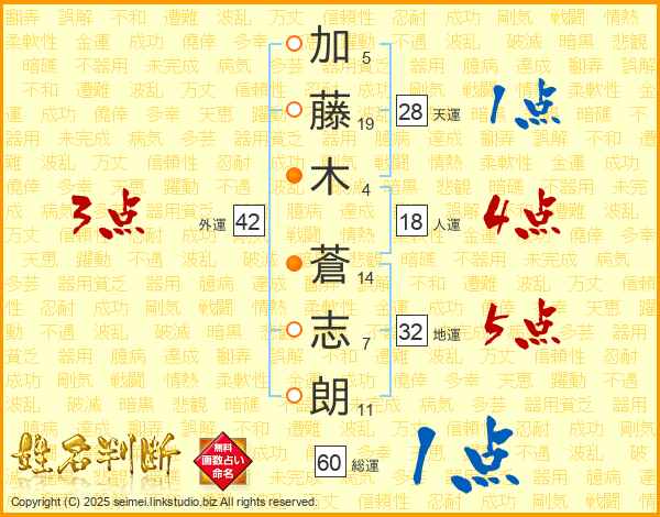 加(5画)藤(19画)木(4画) 蒼(14画)志(7画)朗(11画)