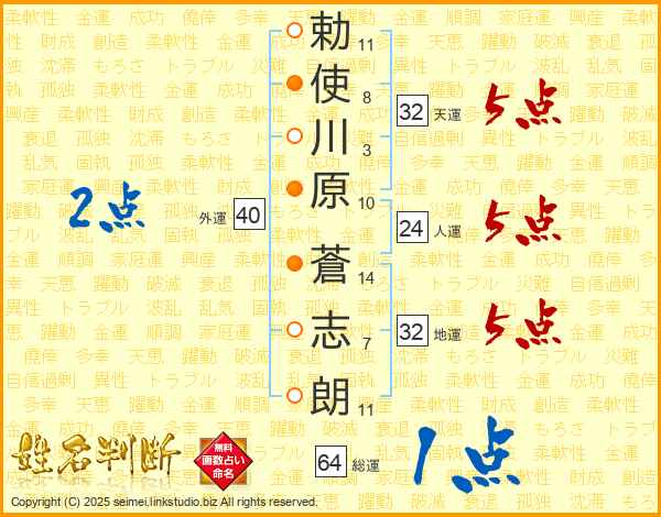 勅(11画)使(8画)川(3画)原(10画) 蒼(14画)志(7画)朗(11画)