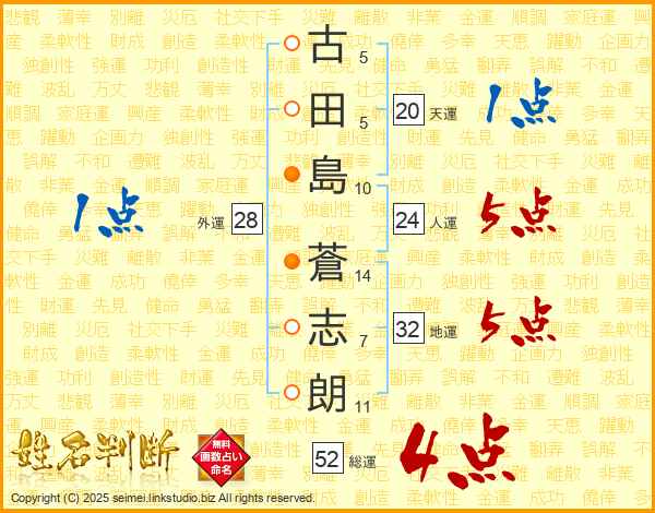 古(5画)田(5画)島(10画) 蒼(14画)志(7画)朗(11画)