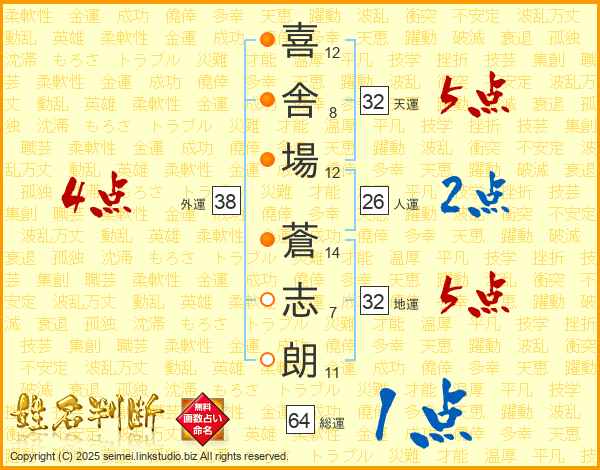 喜(12画)舎(8画)場(12画) 蒼(14画)志(7画)朗(11画)