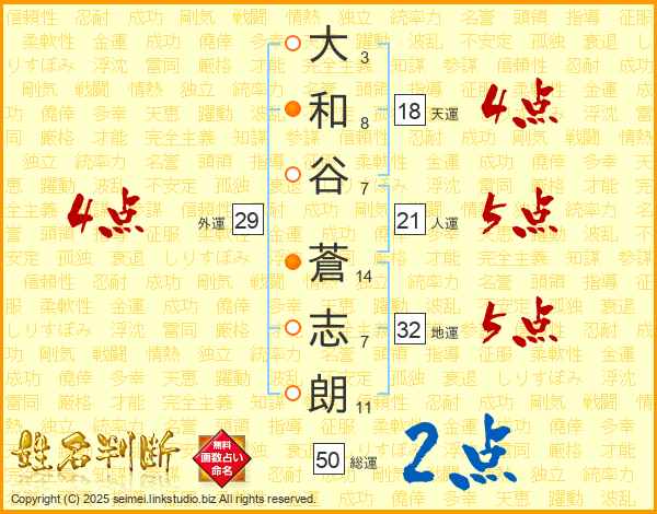 大(3画)和(8画)谷(7画) 蒼(14画)志(7画)朗(11画)