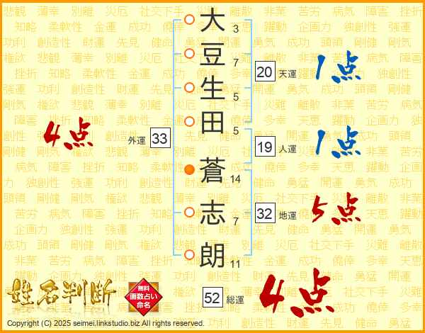 大(3画)豆(7画)生(5画)田(5画) 蒼(14画)志(7画)朗(11画)