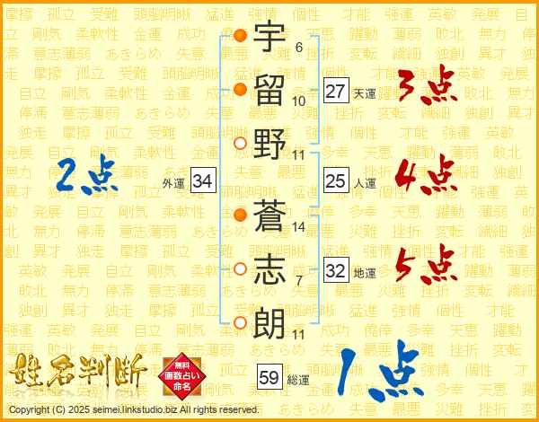 宇(6画)留(10画)野(11画) 蒼(14画)志(7画)朗(11画)