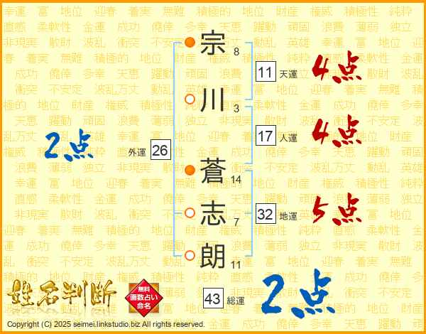 宗川蒼志朗さんの天運は11画の4点!