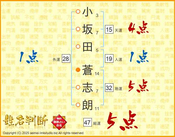 小(3画)坂(7画)田(5画) 蒼(14画)志(7画)朗(11画)