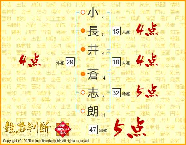 小(3画)長(8画)井(4画) 蒼(14画)志(7画)朗(11画)
