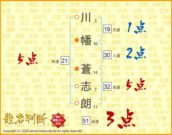 川(3画)幡(16画) 蒼(14画)志(7画)朗(11画)