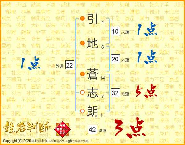 引(4画)地(6画) 蒼(14画)志(7画)朗(11画)