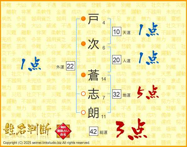 戸(4画)次(6画) 蒼(14画)志(7画)朗(11画)