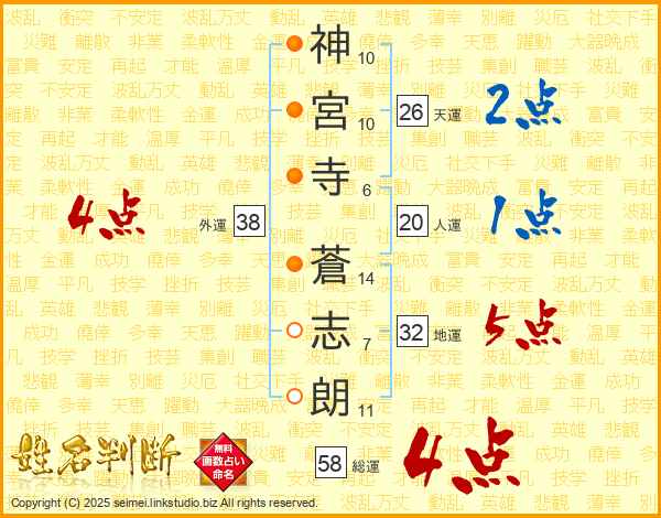 神(10画)宮(10画)寺(6画) 蒼(14画)志(7画)朗(11画)