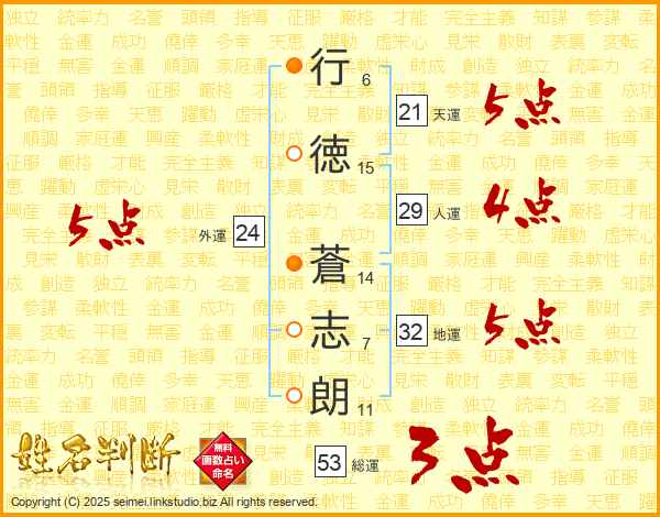 行(6画)徳(15画) 蒼(14画)志(7画)朗(11画)