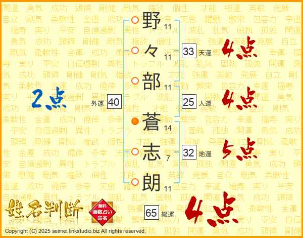 野(11画)々(11画)部(11画) 蒼(14画)志(7画)朗(11画)