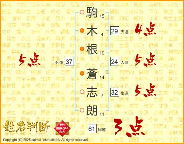 駒(15画)木(4画)根(10画) 蒼(14画)志(7画)朗(11画)