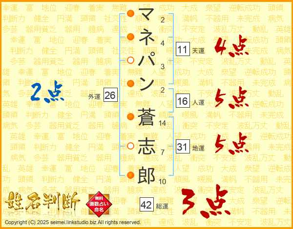 マ(2画)ネ(4画)パ(3画)ン(2画) 蒼(14画)志(7画)郎(10画)