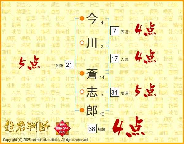 今川蒼志郎さんの総運は38画の4点!