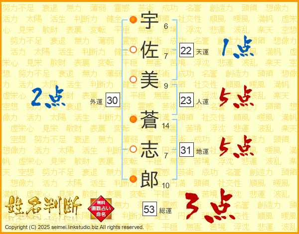 宇(6画)佐(7画)美(9画) 蒼(14画)志(7画)郎(10画)