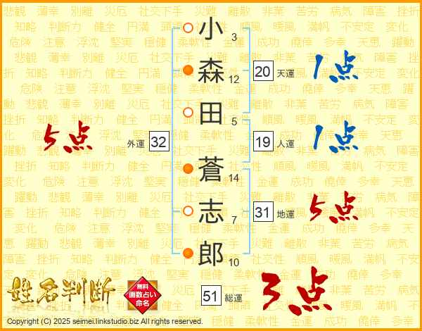 小(3画)森(12画)田(5画) 蒼(14画)志(7画)郎(10画)