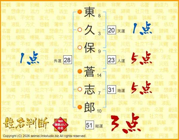 東(8画)久(3画)保(9画) 蒼(14画)志(7画)郎(10画)