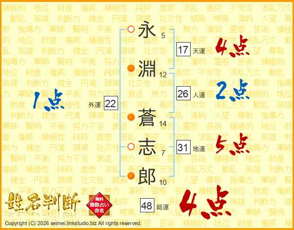 永(5画)淵(12画) 蒼(14画)志(7画)郎(10画)