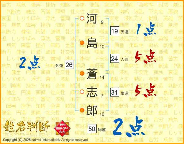 河(9画)島(10画) 蒼(14画)志(7画)郎(10画)