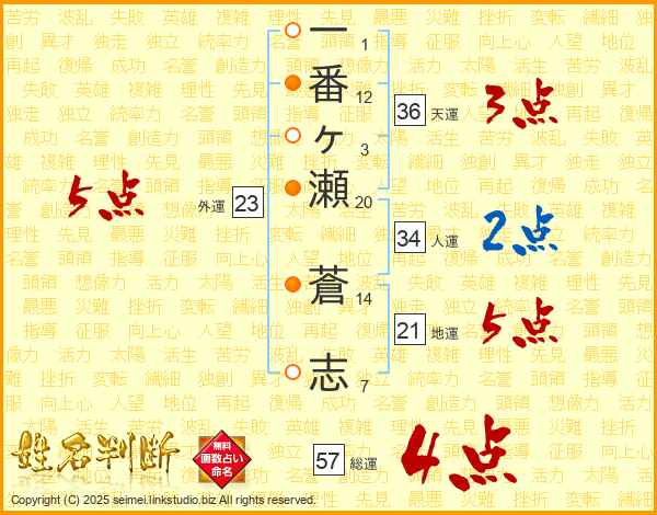 一番ヶ瀬蒼志さんの総運は57画の4点!