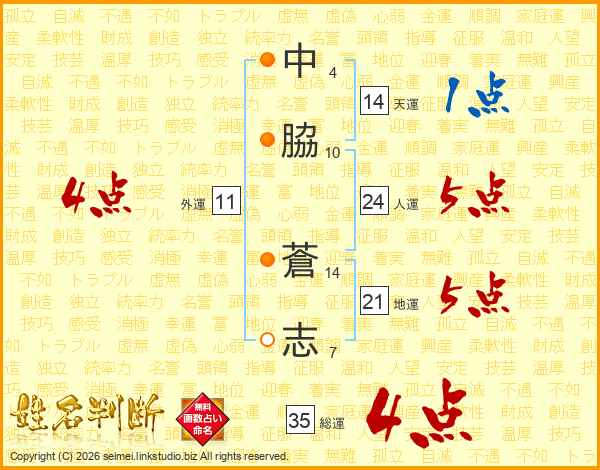 中(4画)脇(10画) 蒼(14画)志(7画)