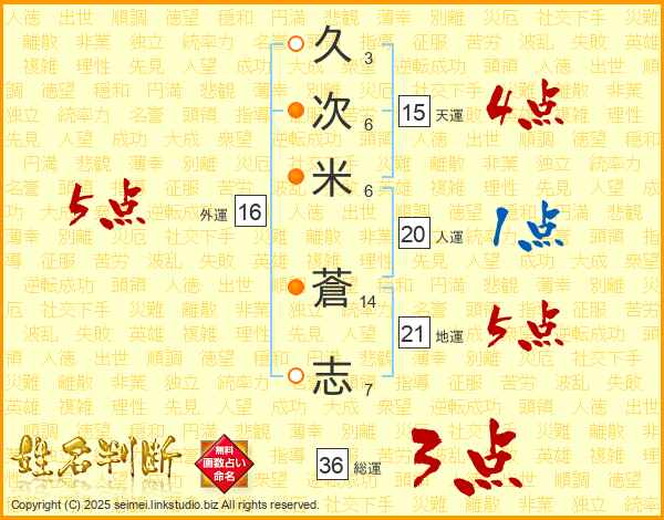 久(3画)次(6画)米(6画) 蒼(14画)志(7画)