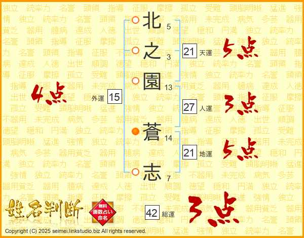 北(5画)之(3画)園(13画) 蒼(14画)志(7画)
