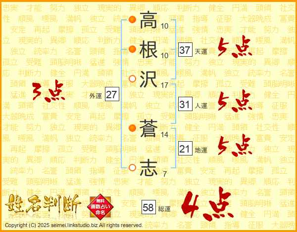 高根沢蒼志さんの総運は58画の4点!