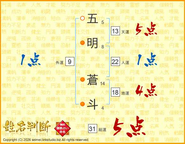 五明蒼斗さんの総運は31画の5点!