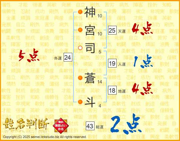 神(10画)宮(10画)司(5画) 蒼(14画)斗(4画)