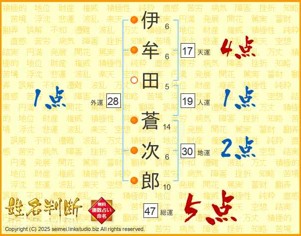 伊(6画)牟(6画)田(5画) 蒼(14画)次(6画)郎(10画)
