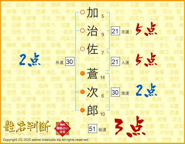 加(5画)治(9画)佐(7画) 蒼(14画)次(6画)郎(10画)