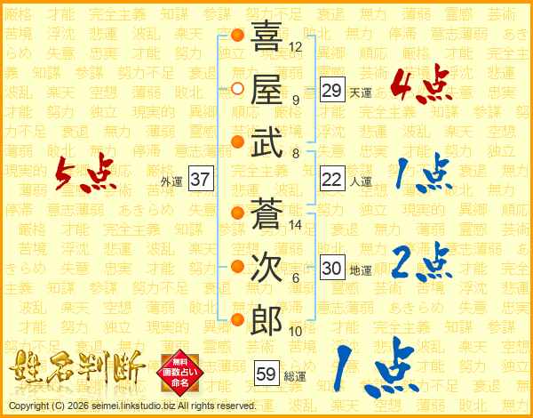喜(12画)屋(9画)武(8画) 蒼(14画)次(6画)郎(10画)