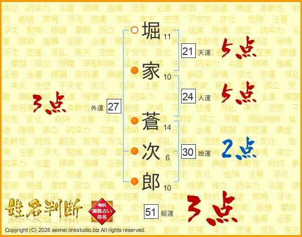 堀家蒼次郎さんの天運は21画の5点!