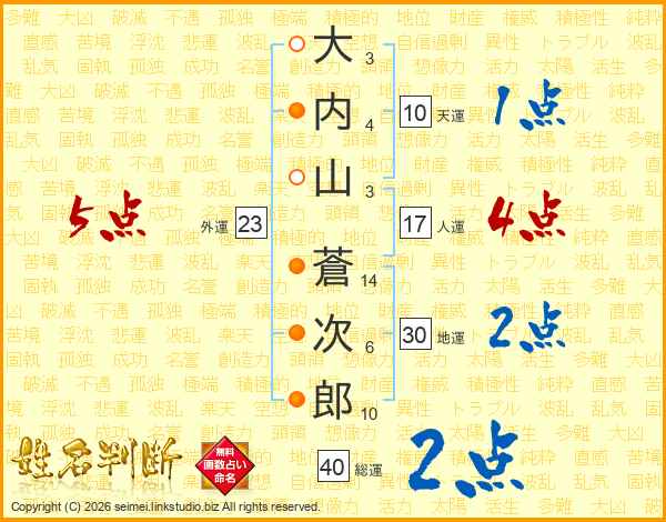 大(3画)内(4画)山(3画) 蒼(14画)次(6画)郎(10画)