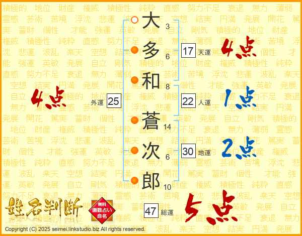 大(3画)多(6画)和(8画) 蒼(14画)次(6画)郎(10画)