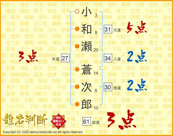 小(3画)和(8画)瀬(20画) 蒼(14画)次(6画)郎(10画)