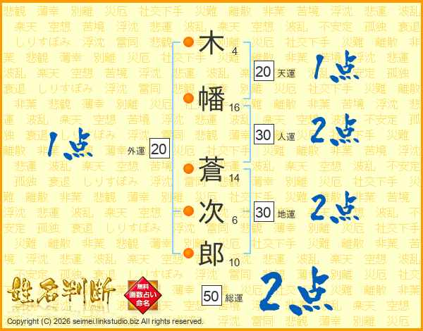 木(4画)幡(16画) 蒼(14画)次(6画)郎(10画)
