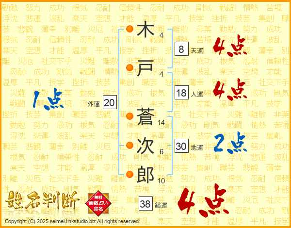 木(4画)戸(4画) 蒼(14画)次(6画)郎(10画)