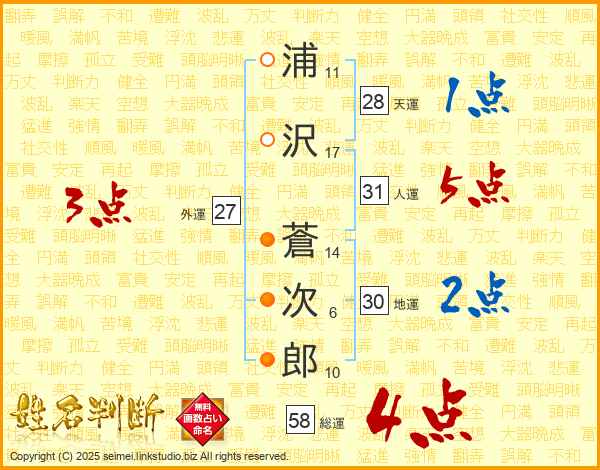 浦(11画)沢(17画) 蒼(14画)次(6画)郎(10画)