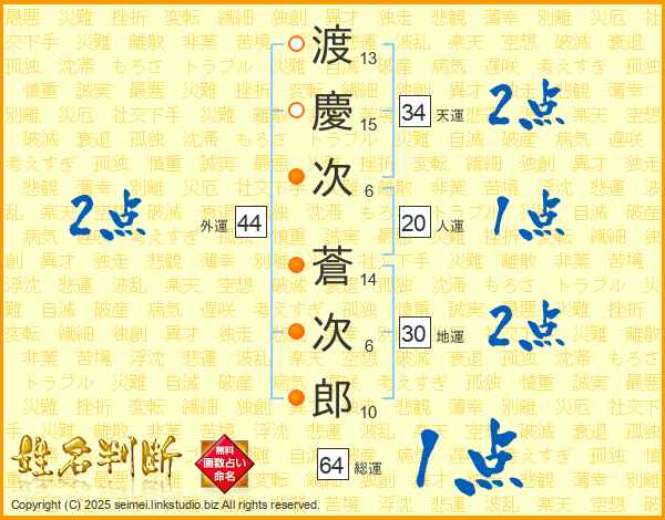 渡(13画)慶(15画)次(6画) 蒼(14画)次(6画)郎(10画)